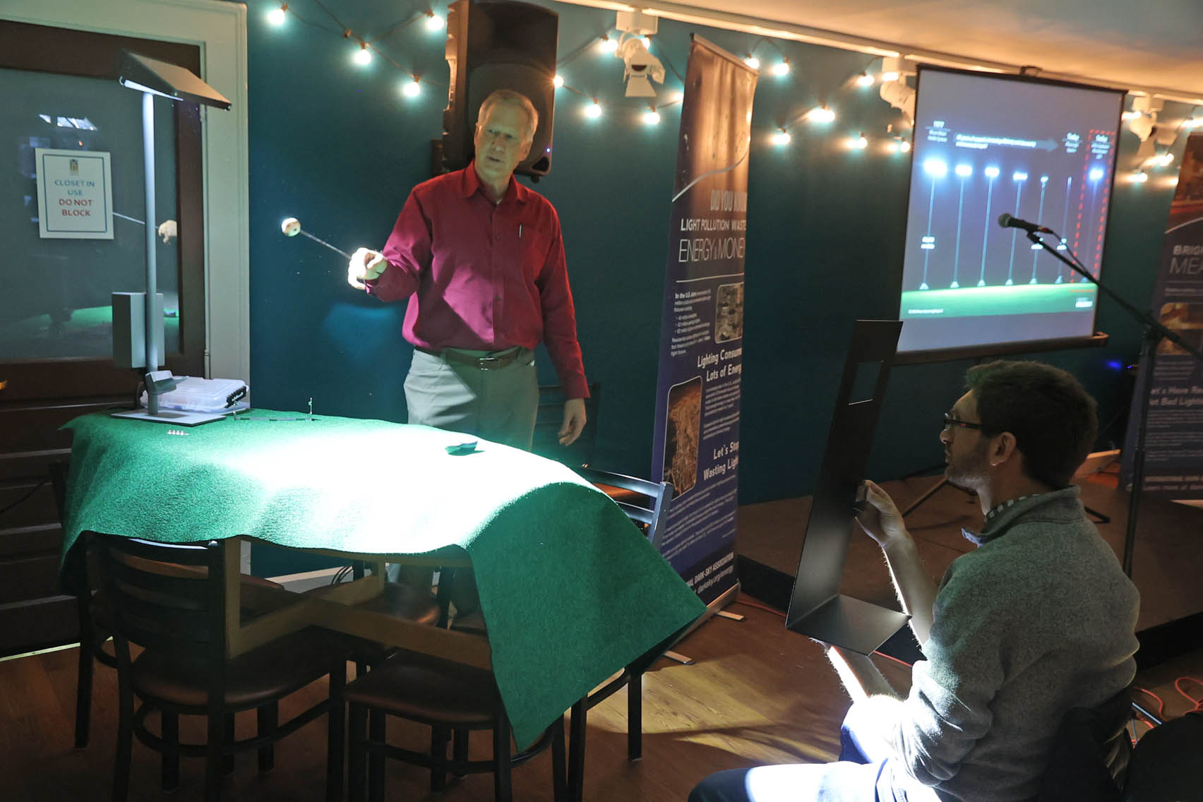 To drive home that point, Mike Limpach vividly demonstrated how Musco’s proprietary, state-of-the art shielding can completely control lighting at a sports complex. In the photo above, a Musco lighting fixture is at upper left. Note how intense the lighting is on the “field” below it — yet none of the fixture’s output is seen by a bystander only a few feet away. (James Lowenthal photo; click on the image to see a larger version).