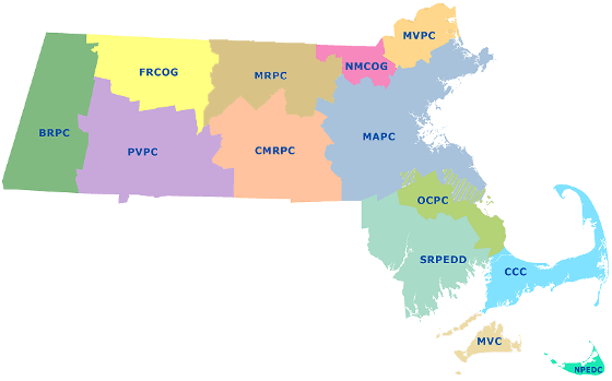 Massachusetts is divided into a network of 13 regional planning agencies (RPAs). These public organizations serve the local governments and citizens within their individual districts through planning, policymaking, and other responsibilities. Notably, they also address issues involving transportation, infrastructure development/maintenance (e.g. streetlights), and environmental stewardship.