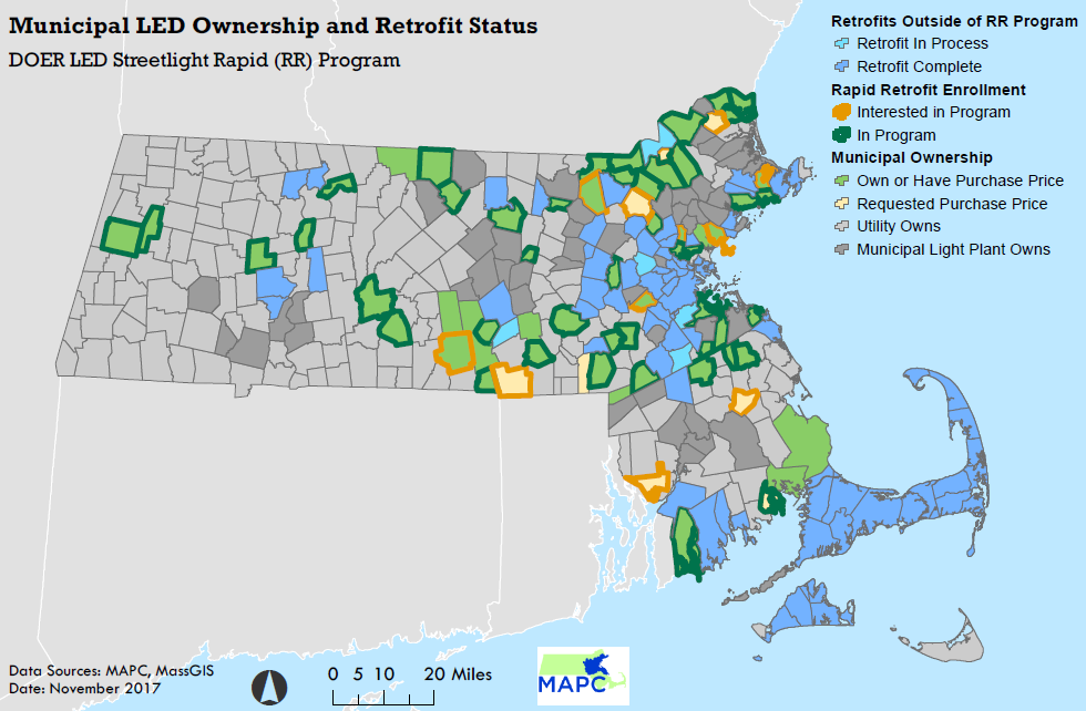 Here’s a map of LED streetlight conversions as of November 2017, compiled by the Metropolitan Area Planning Council: